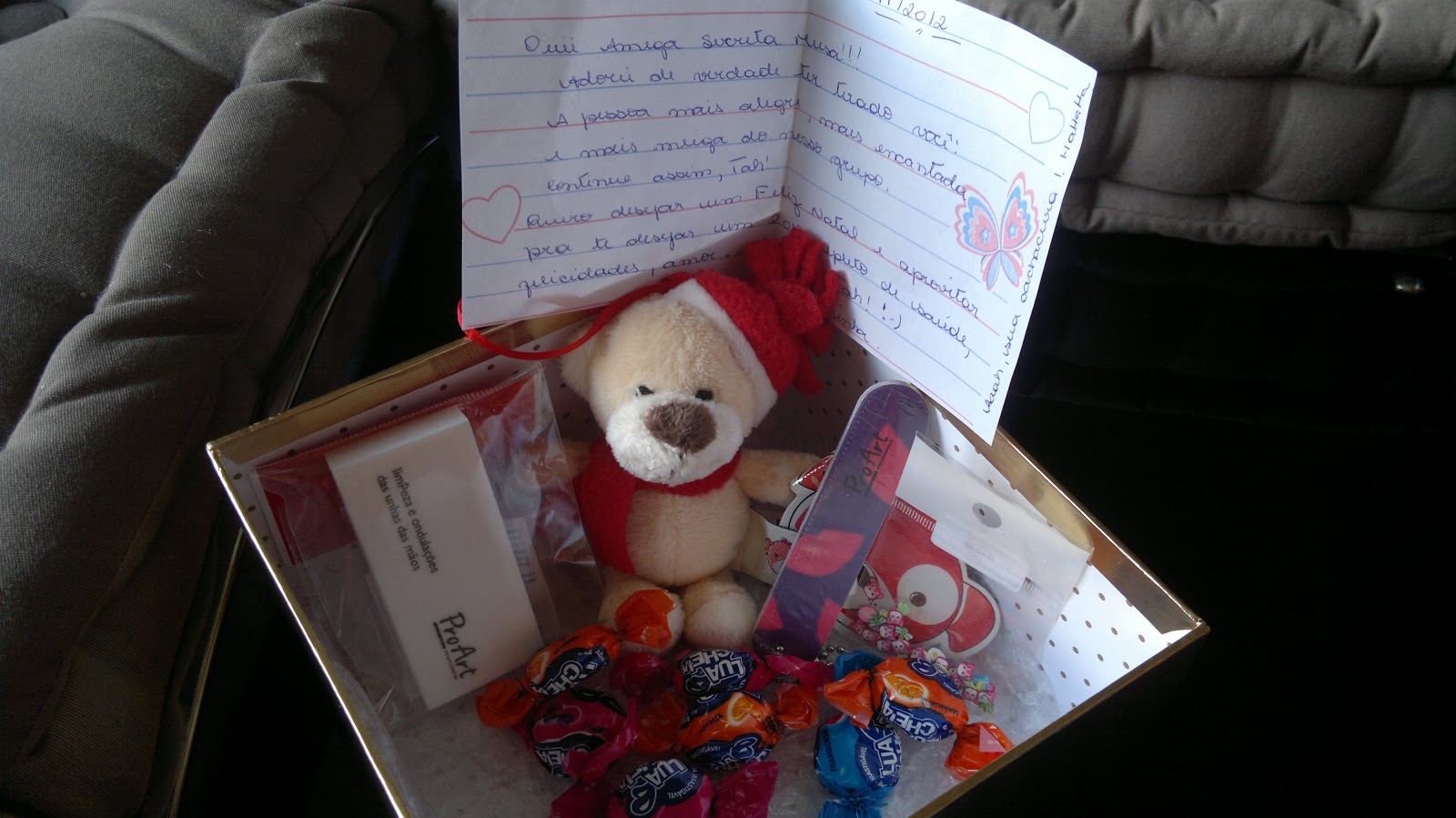 Além dos esmaltes -que é a ideia principal do AS's- ela me mandou outros mimos lindooooooos como balinhas (que acabou obvio), um chocolate óóótimo (que obviamente eu comi no dia *.*), esse urso NOEL lindooooooooooooo *.* uma lixinha linda que virou meu chaveiro e essa lixa mara da ProArt que uso direto e ameeeeeeeeei *.*